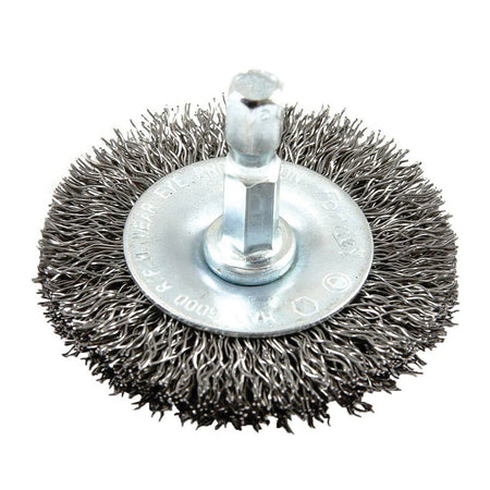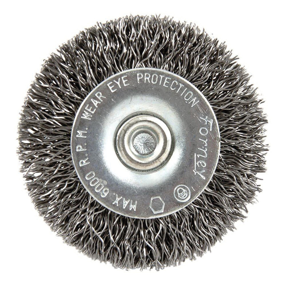 Forney® Wheel Brush, 2 in Brush Diameter, 0.012 in Bristle Diameter, Crimped Bristle, Steel Bristle, 6000 rpm Maximum Speed, 1/4 in Shank, Shank Mounting, For Use With: 1/4 in Dia Electric Power Drills and Pneumatic Drills, Additional Information: Hex Shank