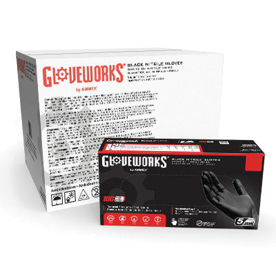 GLOVEWORKS® by AMMEX® GPNB44100 Disposable Gloves, Unisex, M, 240 mm L, Beaded Cuff, Nitrile Glove, Black Glove