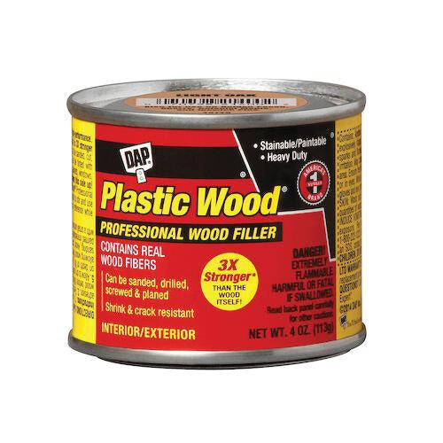 DAP® Professional Wood Filler, 4 oz Net Content, Paste Form, Natural, Odor/Scent: Strong Solvent, Composition: Limestone, Acetone, Cellulose, Cellulose Acetate, Titanium Dioxide, Propylene Carbonate, Isopropyl Alcohol, Ethyl Acetate, n-Butyl Acetate, Attapulgite, Quartz, <1 hr, 2 to 24 hr Dry Time, 40 deg F, Density: 0.68 to 0.89 g/cc, Applicable Materials: Wood, Additional Information: 8 in L x 5-1/2 in W x 5 in H Dimensions, 12 months Shelf Life