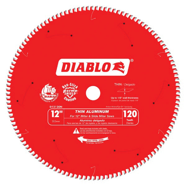 DIABLO® Saw Blade, 12 in Diameter, Carbide Cutting Edge, Aluminum Blade, 0.071 in Blade Thickness, TCG Teeth, 120 Teeth, 1 in Arbor, Laser Cut, 0.091 in Kerf, -5 deg Hook Angle, 5000 rpm Maximum Speed, Finish: Perma-SHIELD®-Coated, Cut Materials: Brass, Copper, Fiberglass, Plastic, Thick Aluminum, For Use With: Miter Saws, Slide Miter Saws