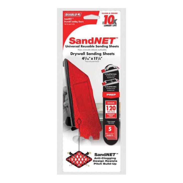 DIABLO® SandNET ™ Reusable Drywall Sanding Sheet, 11-1/4 in Length, 4-3/16 in Width, 120 Grit, Medium Grit Grade, Ceramic Blend Abrasive, Cut Materials: Drywall, Plaster and Wood, For Use With: Hand Sander