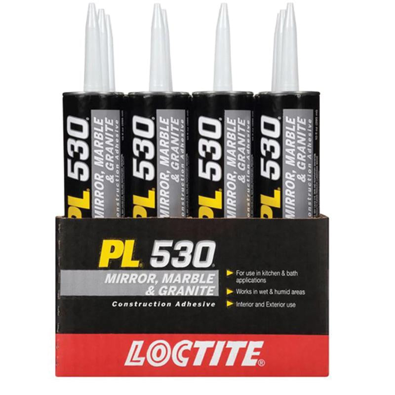 LOCTITE® Mirror/Marble and Granite Adhesive, 10 oz Net Content, Cartridge Container, Composition: Limestone, Kaolin, Acetone, Resin Acids and Rosin Acids, Esters with Pentaerythritol, Methyl Acetate, Titanium Dioxide, Quartz, Paste Form, Light Tan, Odor/Scent: Acetone, 30 min Dry Time, 2 to 7 days Curing Time, 15 min Setting, 13.6 ft, 30.6 ft Coverage Area, 7 pH, 1.44 Specific Gravity, 5.67 g/L VOC, 210000 cPs Viscosity, Applicable Materials: Backsplashes, Brick, Ceramic, Concrete, Drywall, Fiberglass, Glass, Granite, Marble, Metal, Mirrors, Tile, -20 to 150 deg F