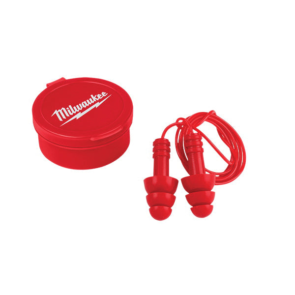 Milwaukee® Reusable Corded Ear Plugs, One-Size, Tapered Shape, Noise Reduction Rate (NRR): 26 dB, Push-In Insertion, Silicon Plug, Red Plug, Red Cord
