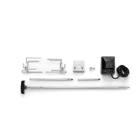 - Everything you need to create delicious rotisserie meals right away, including; heavy duty rotisserie motor, bracket for attaching it to the grill, hexagonal stainless steel spit rod, hexagonal stainless steel spit rod extension, stop bushing, two rotisserie forks, removable end handle, and counterbalance