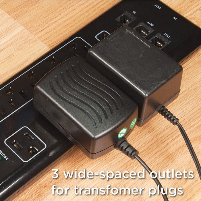 - Five grounded outlets and three wide spaced outlets to fit oversized transformer plugs