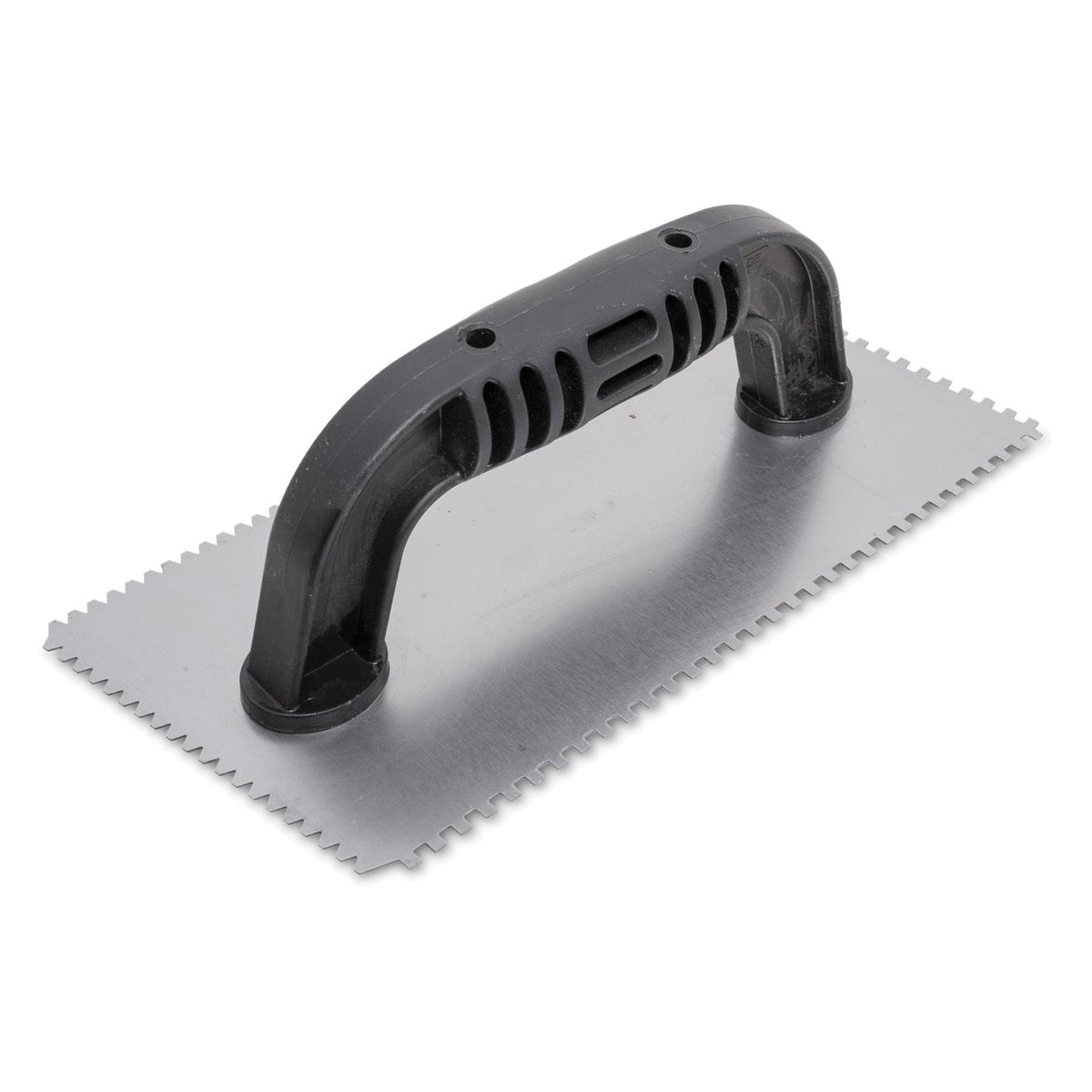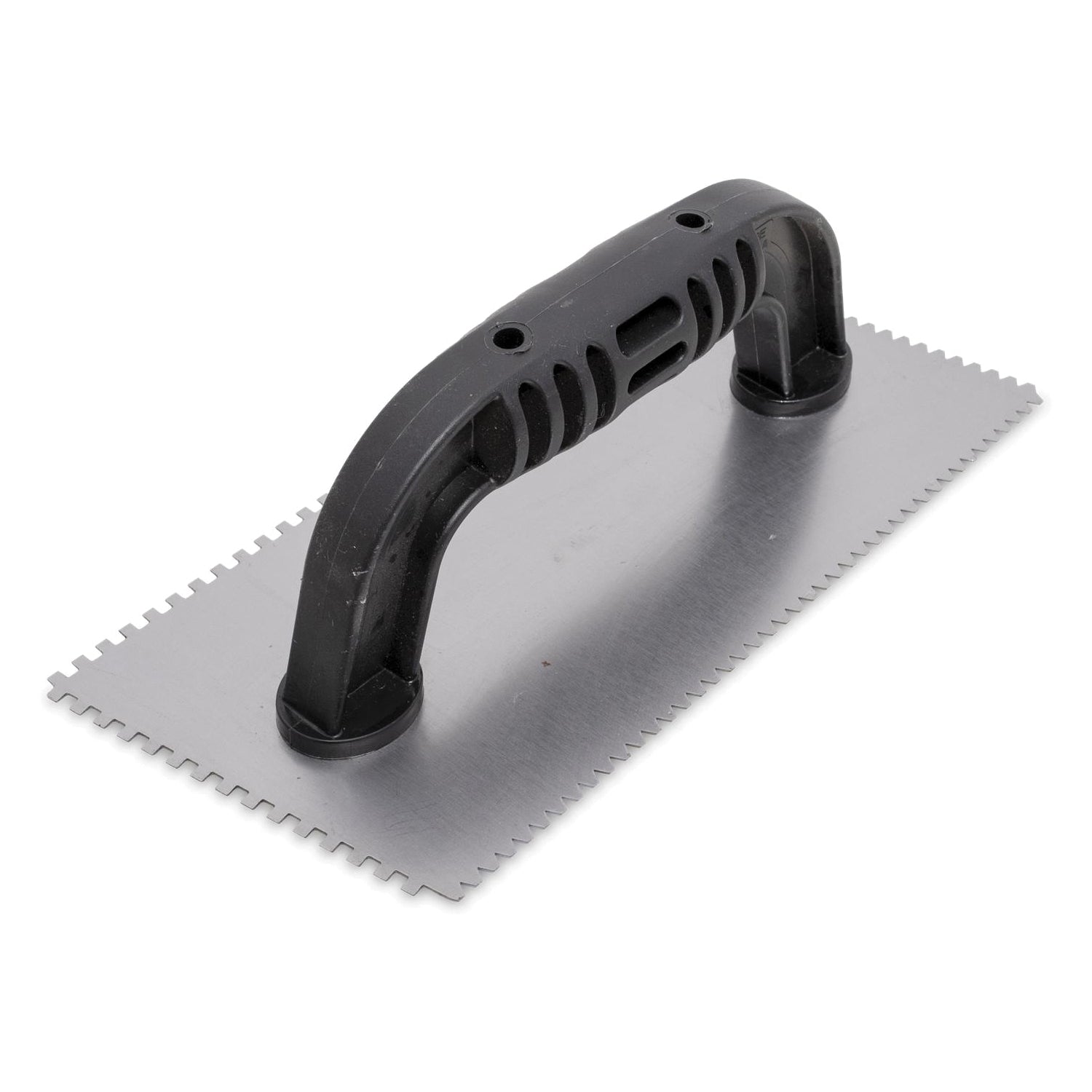 QLT® Economy Notched Trowel, Flat V Notch Shape, 1/8 x 1/8 x 1/16 in, 1/8 x 1/8 x 1/8 in Notch, 9 in Blade Length, 3 in Blade Width, Steel Blade, 110 deg Angle