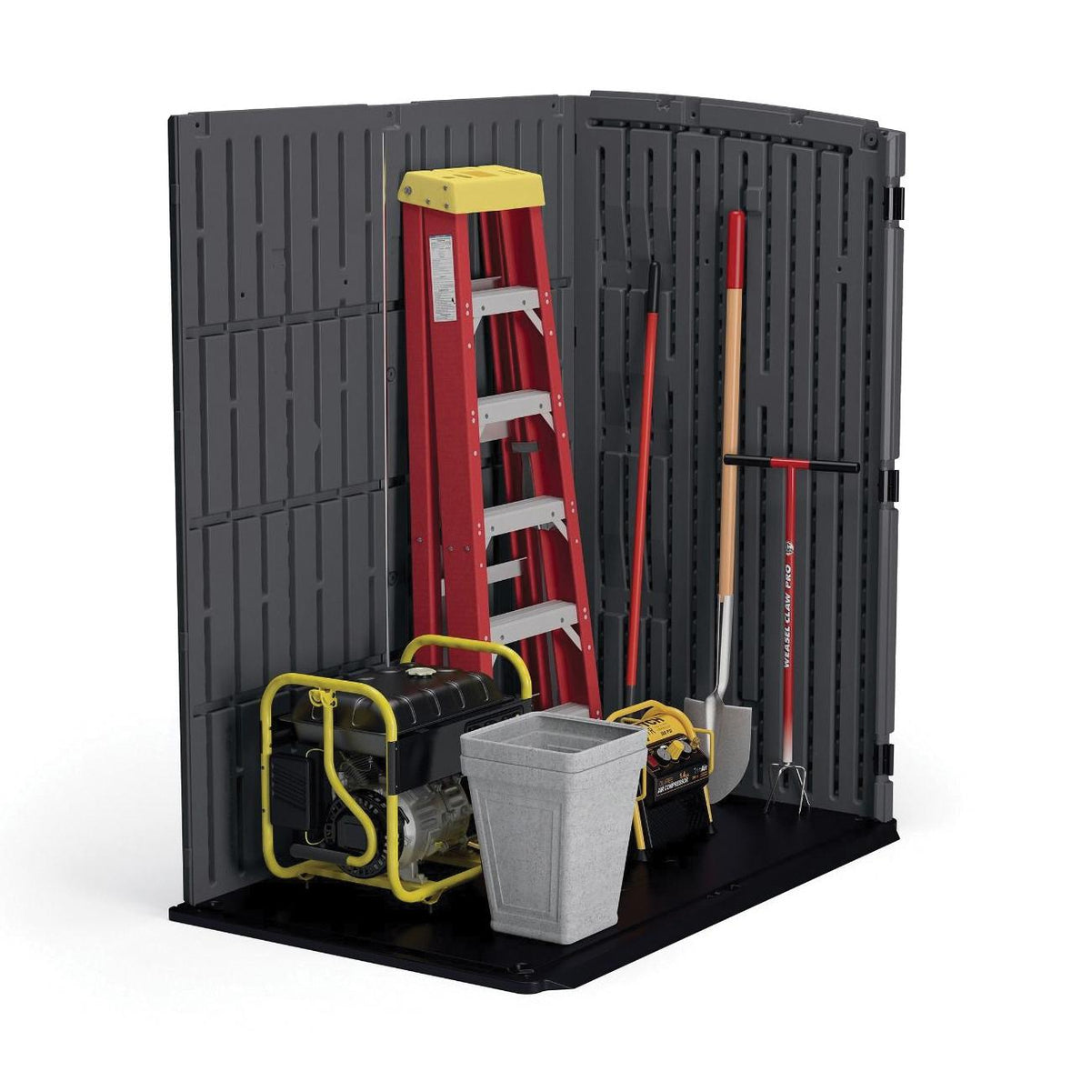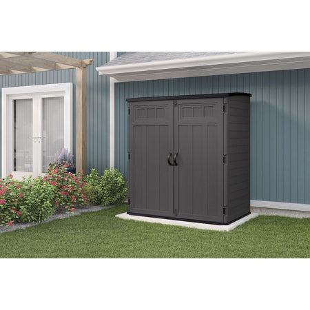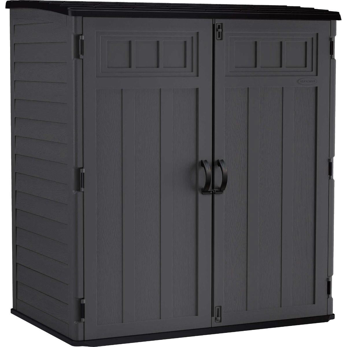 Suncast® Extra Large Vertical Shed, 106 cu-ft Storage, Peppercorn Side Wall, 2 Doors, Peppercorn Door, 64 in Door Opening Width, 71-1/2 in Door Opening Height, Black Roof, 5 ft 10-1/2 in Overall Width, 6 ft 5-1/2 in Overall Height, 3 ft 8-1/4 in Overall Depth, Additional Information: 6 ft 2-3/4 in H x 5 ft 5-1/2 in W x 3 ft 2-1/2 in D Interior Dimensions